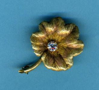 15ct Gold geranium leaf pin with diamond ccnter Circa 1910 Stock No 6659 |
